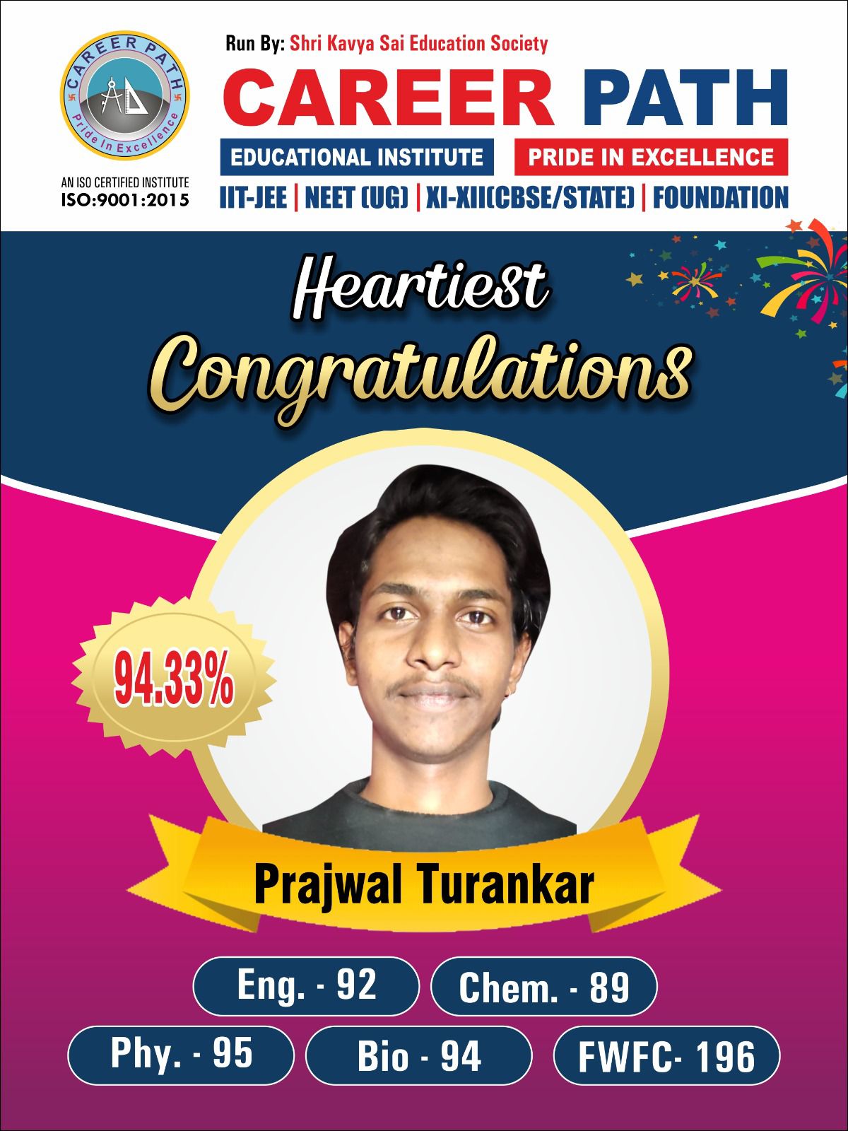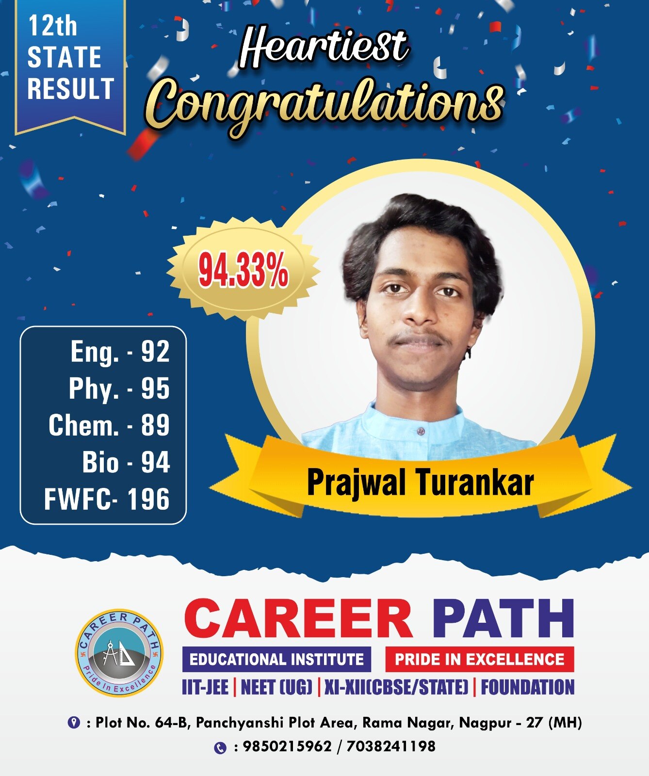 "Scoring 94.33% in HSC 2024 has been a proud moment for me, and I owe this success to the incredible support and teaching at Career Path Institute. Special thanks to RK Sir, DB Sir, AK Sir, and Minal Ma'am for their dedication, guidance, and constant encouragement. The Career Path team truly shaped my journey and helped me believe in myself."— Prajwal Turankar