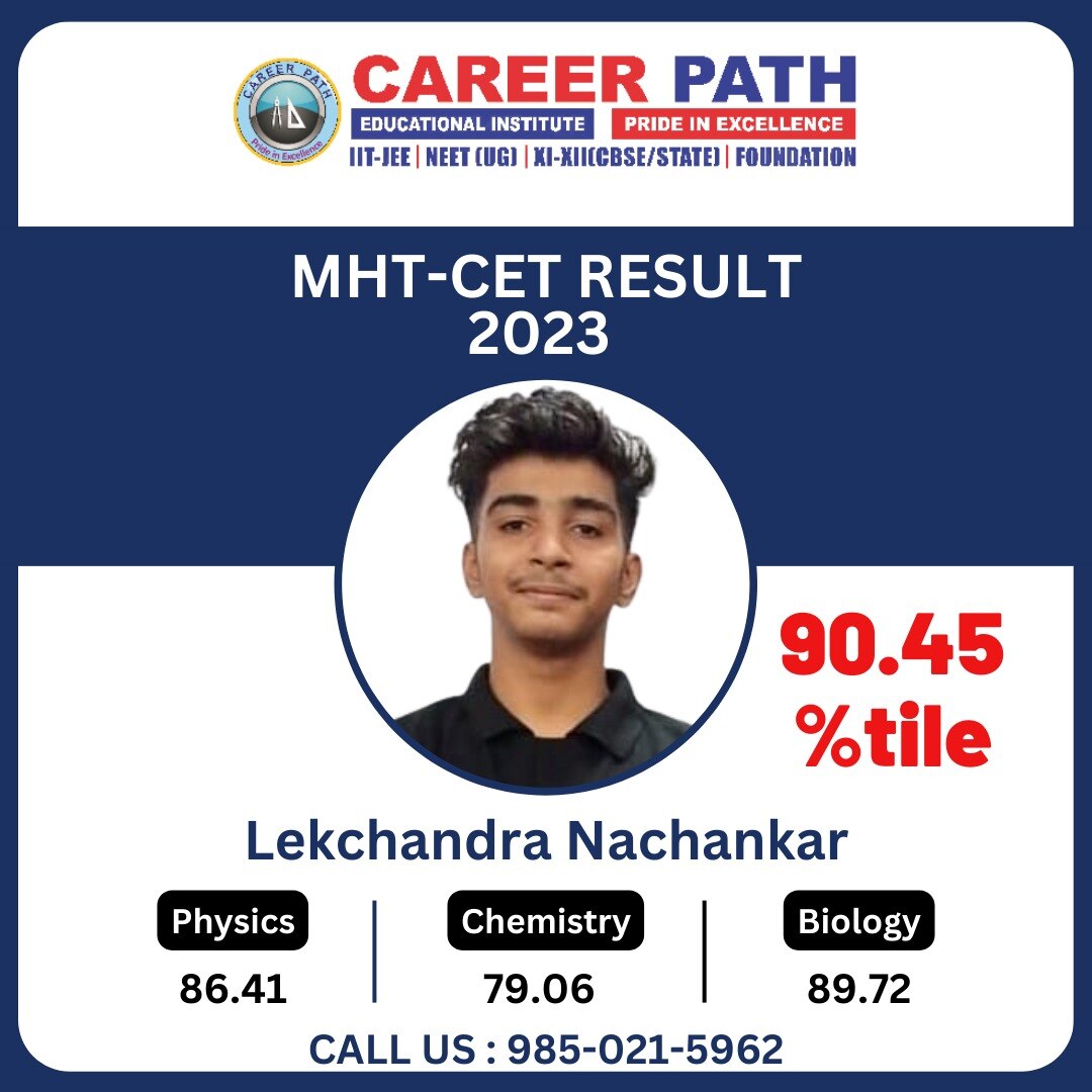 "Securing 90.45 percentile in MHT-CET (PCB) wouldn’t have been possible without the consistent guidance and motivation from Career Path Institute. The focused teaching methods and doubt-solving support played a big role in my preparation. I’m truly thankful to the entire team for helping me stay confident and goal-oriented throughout." — Lekchandra Nachankar