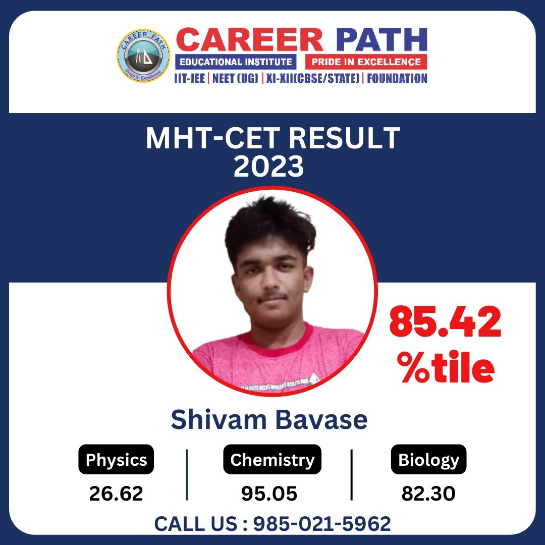 "Career Path Institute helped me stay focused and consistent in my preparation. With their support, I was able to score 85.45 percentile in MHT-CET (PCB). The structured guidance and concept clarity made all the difference." — Shivam Bawase