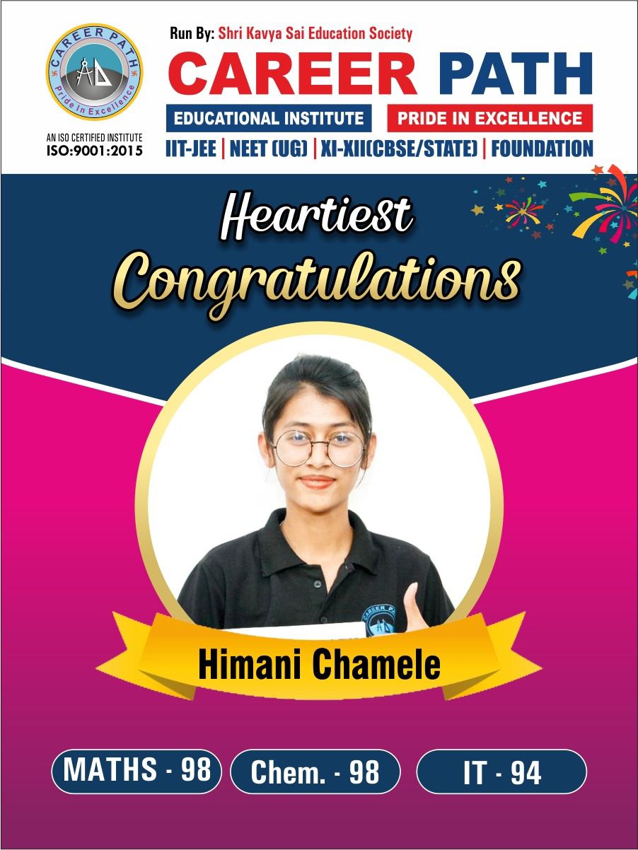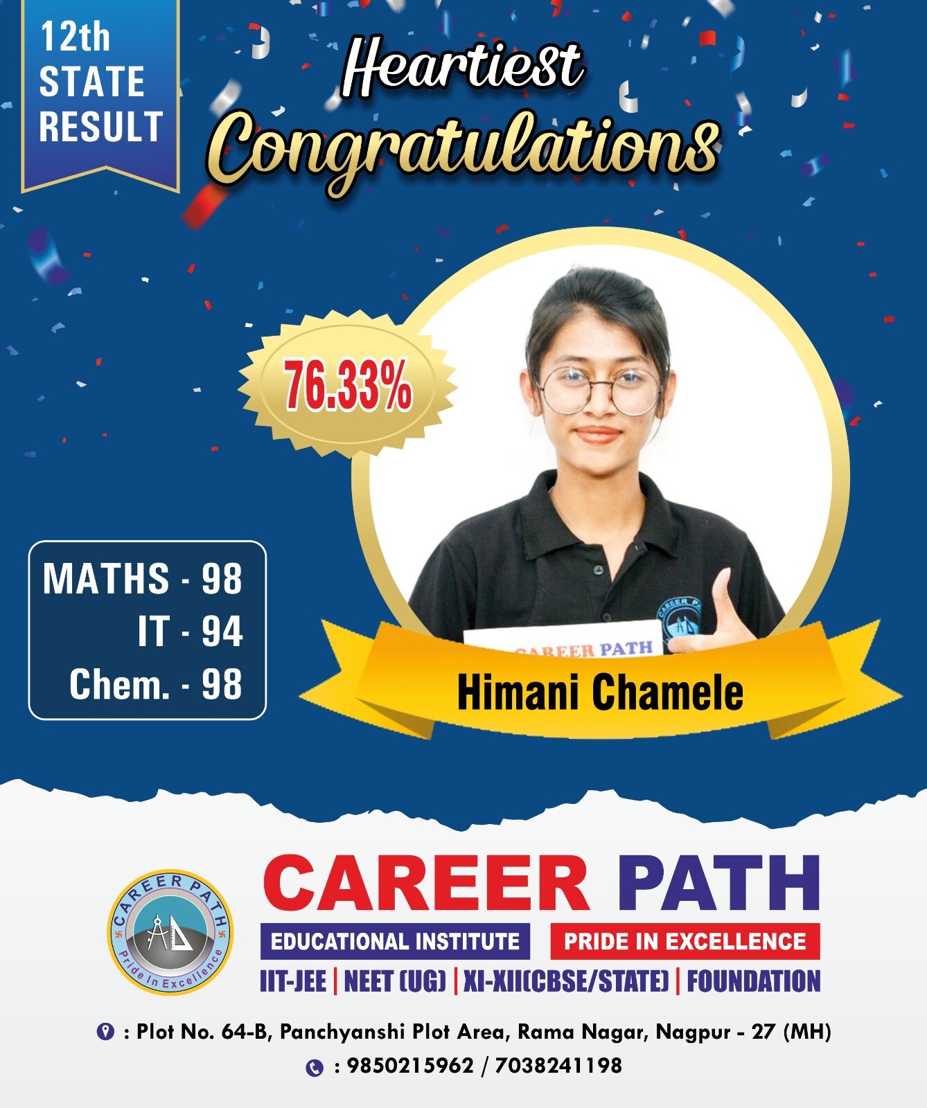 "Career Path Institute helped me turn my dreams into reality. The supportive teachers, focused study material, and personalized guidance made all the difference. Scoring 98 in both Maths and Chemistry, and 94 in IT wouldn’t have been possible without their encouragement. I'm truly grateful!" — Himani Chamele